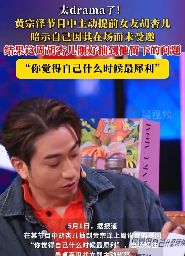 节目上的“抓马”环节还挺多的,特别是胡杏儿抽到了前男友黄宗泽上周录制节目时留下的问题“你觉得自己什么时候最犀利”,引发了一系列戏剧化反应和公众讨论。